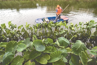 海安县推进河长制全区域全覆盖,通过在沟塘里种植水生植物,吸附河道污染物、净化水质。图为5日,园庄村河道保洁员在胜利河上养护茨菰、芋头等水生植物。