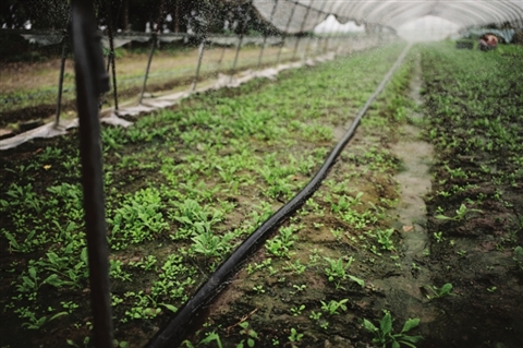 新民村是董浜镇的一个蔬菜种植基地,这里有着成片的蔬菜棚。上午11点,71岁的老农民黄根元正在查看刚刚种下的半亩萝卜苗。他将一旁的水龙头打开,铺设在蔬菜地的一根黑色水管瞬间下起了“微雨”,滋润着整片蔬菜棚地。“如果要我挑担浇水施肥肯定是干不动咯。”黄根元笑着说。现在水管铺到了地下,实现了水肥一体化灌溉,“想要浇水就浇水,想要施肥就施肥,15分钟全搞定。”