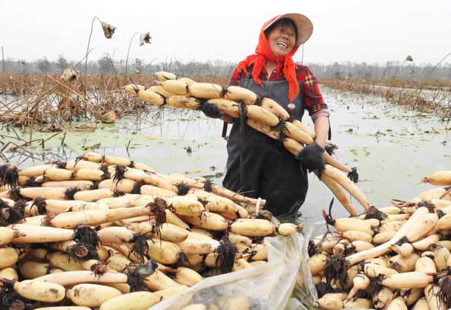 10月10日,江苏连云港市海州区浦南镇富安村村民在采收莲藕。金秋时节,江苏连云港市海州区1万余亩无公害浅水藕喜获丰收,村民加紧采收上市供应市场。
